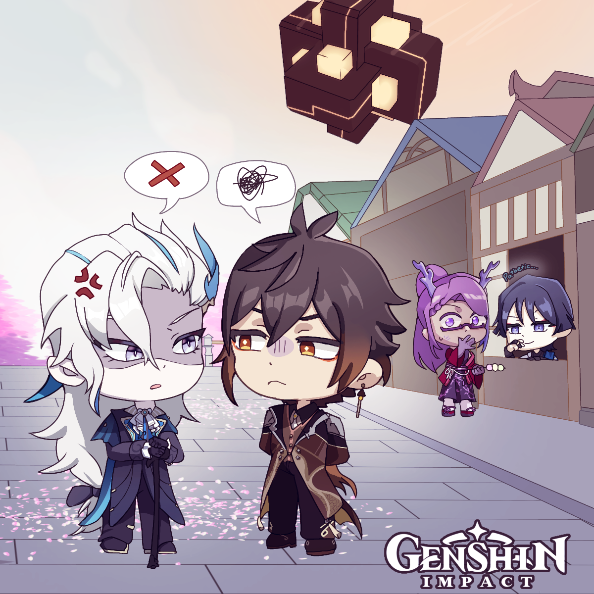 This was a commission! I was asked to make a drawing in Genshin's Chibi style, one problem, though... Genshin has multiple chibi styles? The references I used were for the chat emotes, by the time I drew everything other than the clothes I found out that the birthday art had a different artstyle, and so were the livestream chibis, AND that there were no full body images of Neuvillette and Zhongli in the emote style