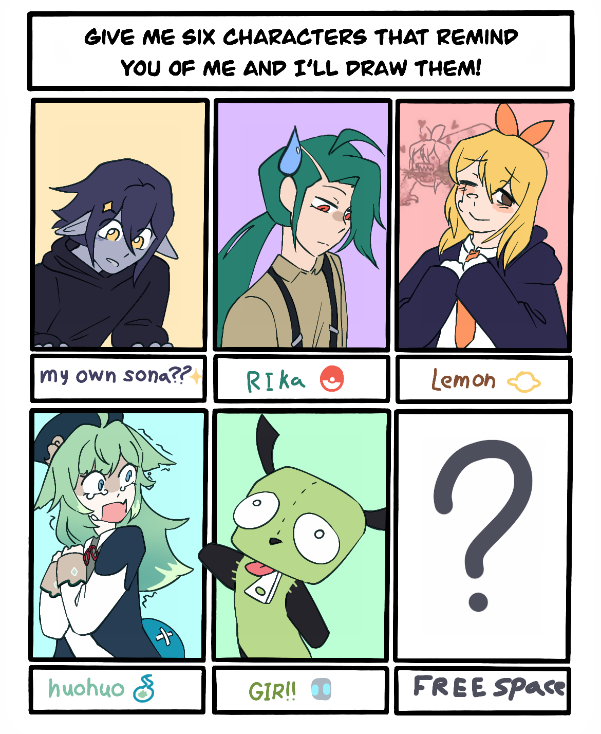 Considering the platform I posted the original template on,I suspect other than my Sona and Lemon, most of these suggestions were just characters my followers wanted me to draw, rather than characters that were like me