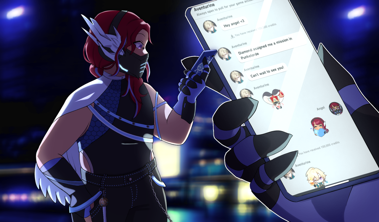 I really like the lighting here, and the concept was pretty cute in my opinion. At the time I didn't fully finish the penacony story so I wasn't very sure how Aventurine would talk, I was mainly going off the fanfiction I read